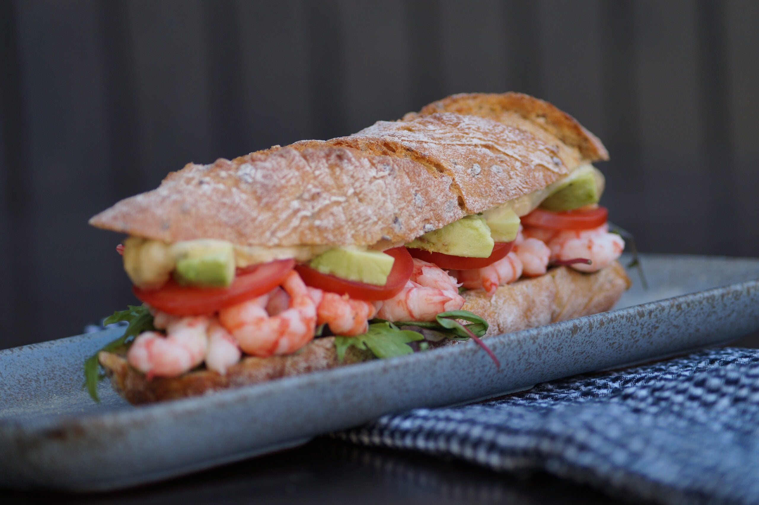 Sandwich med håndpillede rejer, friske tomater, avocado, hjemmelavet pesto og aioli: 89,-